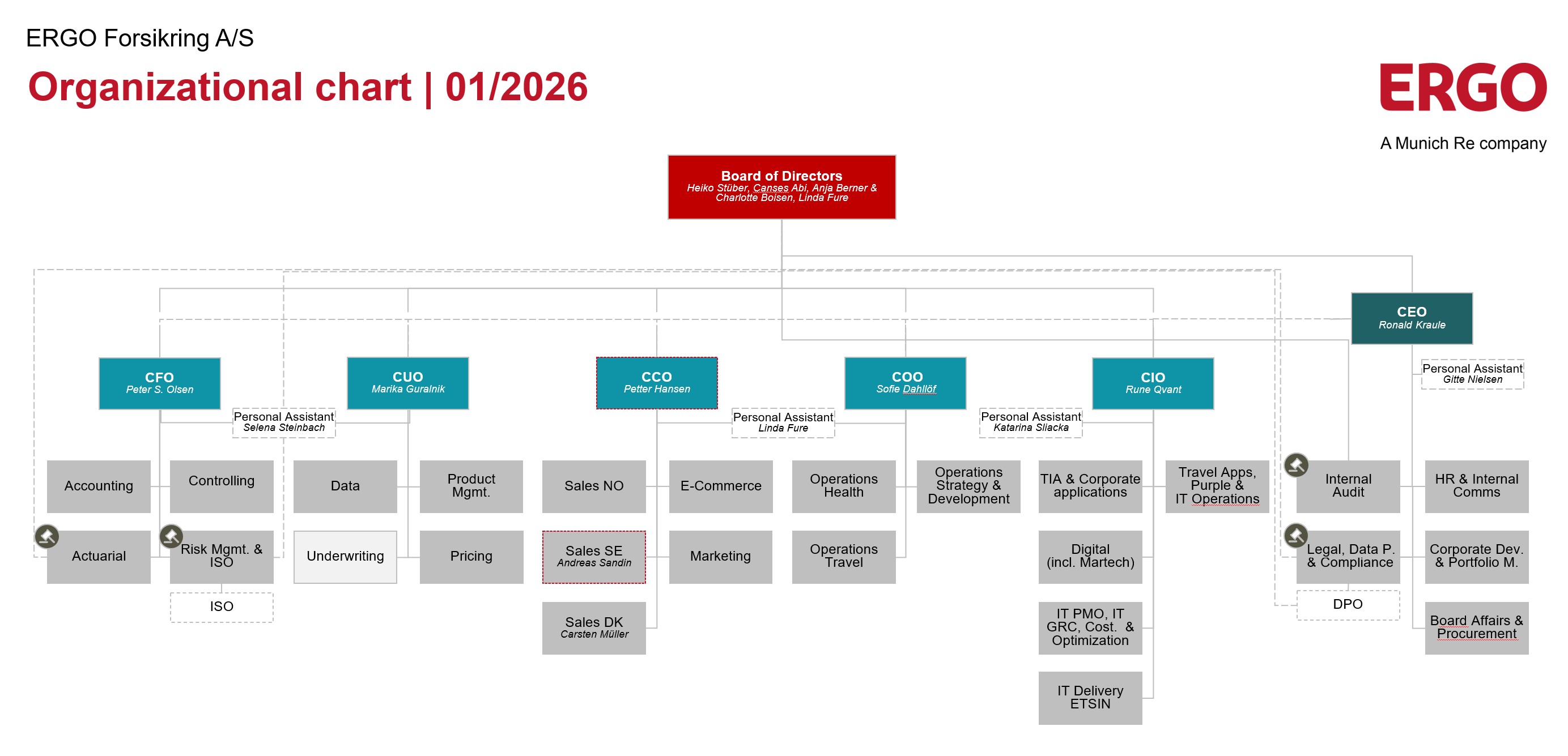 ERGO Nordics Compliance System hanteras/kontrolleras av den lokala efterlevnadsfunktionen (Kristoffer Sandvad Myralf). Den lokala compliance-funktionen rapporterar direkt till ERGO Nordics ledningsgruppen och styrelsen för ERGO Nordic samt till ERGO Compliance.